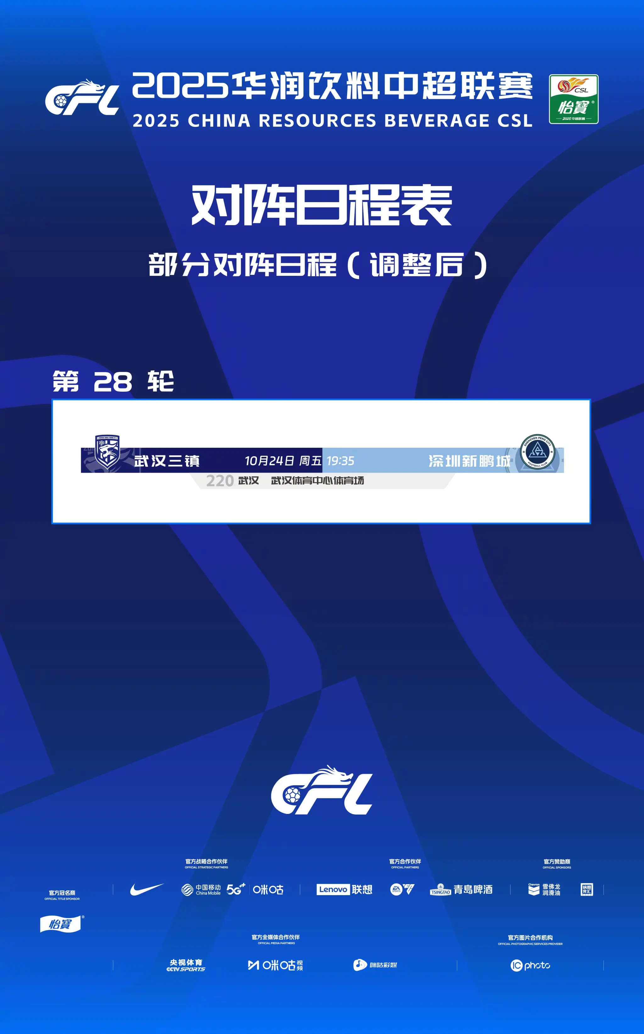 虎扑09月28日讯 中超联赛官方消息,根据2025中超联赛赛程,武汉三镇对阵深圳新鹏城比赛原定于10月25日19:35在武汉体育中心体育场进行。